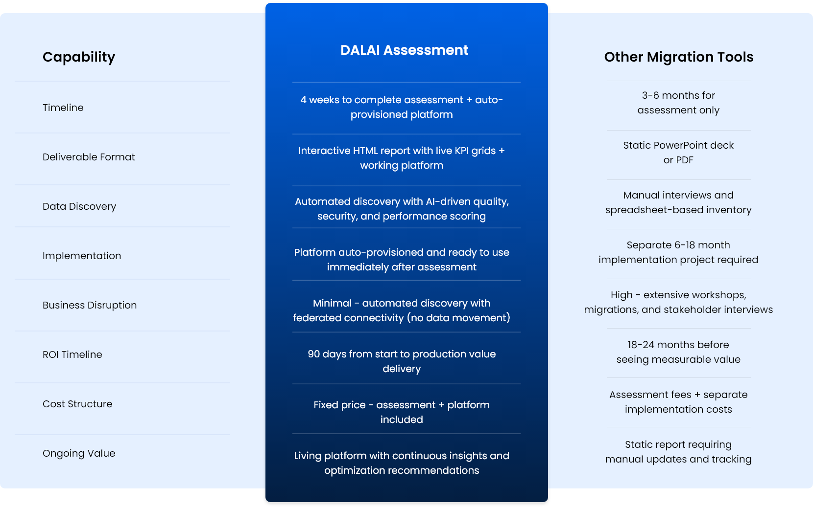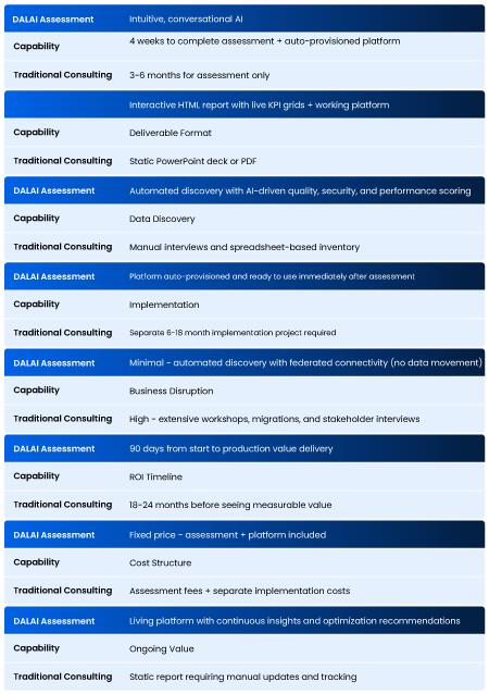 Complete DALAI Assessment in 4 weeks that automatically auto-provisions your ready-to-use Insights & Agentic AI Platform. Deploy and deliver results in 90 days.